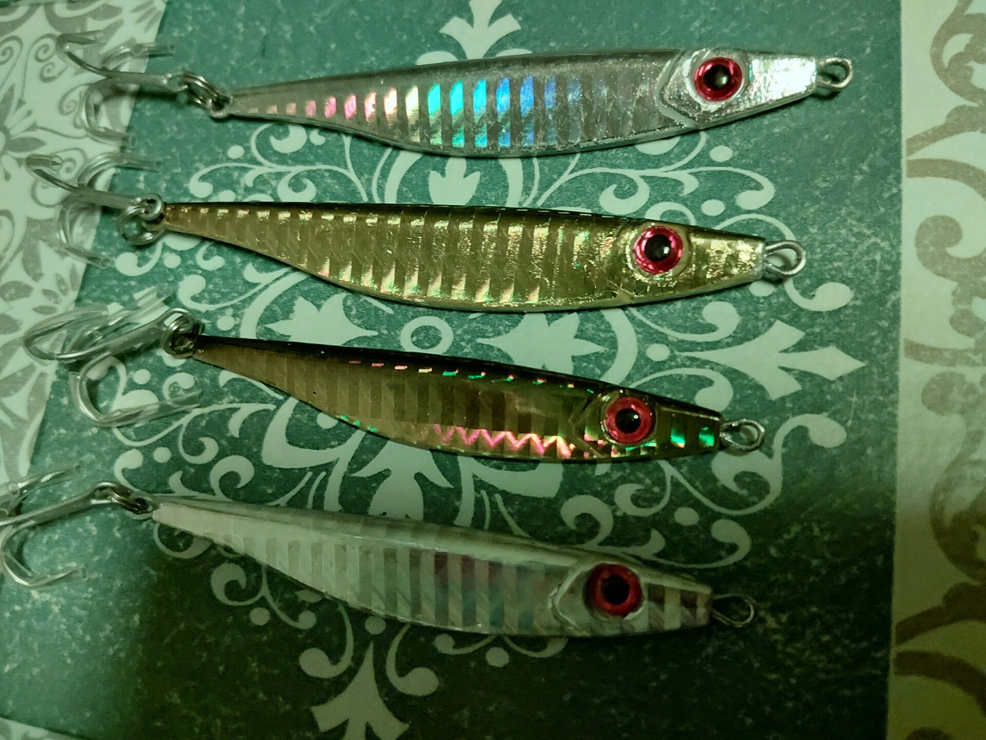 Selger 4 samlet kr 100,- de er 2 18g og 2 25g Passer til sjøfiske, stang eller pilking. Siden de ser ut som glinsende sild så får du lett torsk, ørret, sei, lyr, hvitting, osv