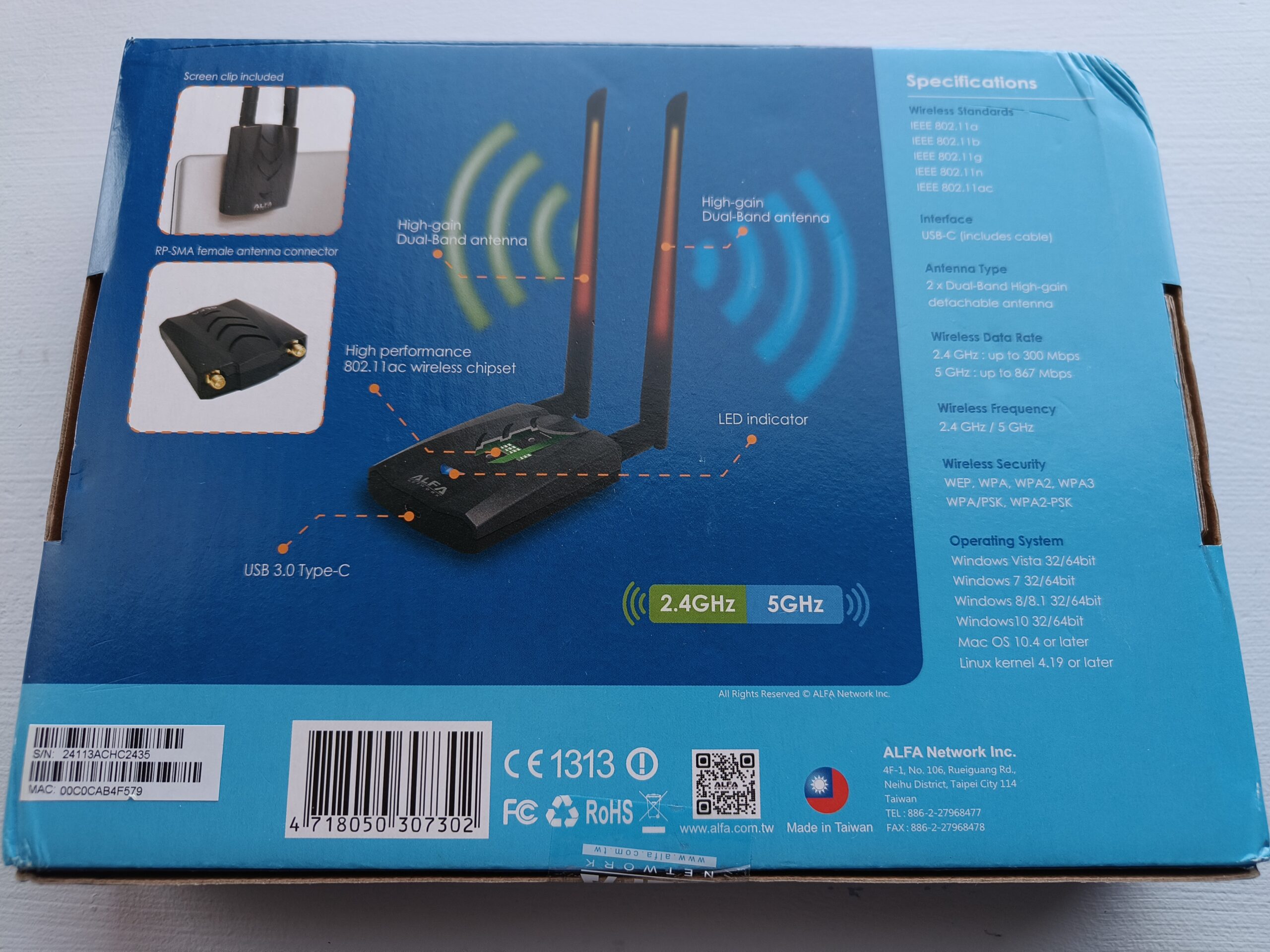 AWUS036ACH Chipset RTL8812AU Standard Wireless IEEE 802.11ac/a/b/g/n Frequency 2.4GHz / 5GHz RF connector RP-SMA female x 2 Antenna 2.4GHz + 5GHz Dual-Band 5dBi dipole antenna Wireless Speed 802.11a : 6,9,12,18,24,36,48,54Mbps 802.11b : 1, 2, 5.5, 11Mbps 802.11g : 6,9,12,18,24,36,48,54Mbps 802.11n : up to 300Mbps 802.11ac: up to 867Mbps Wireless Security WEP, WPA, WPA2, WPA Mixed, WPS Interface USB 3.0 OS Supported Windows XP, Vista, 7 and 8/8.1 Mac 10.5.x or later Linux Package Contents 1x AWUS036ACH 2x detachable High Gain 5dBi antenna 1x USB 3.0 cable 1x Quick Setup Guide
