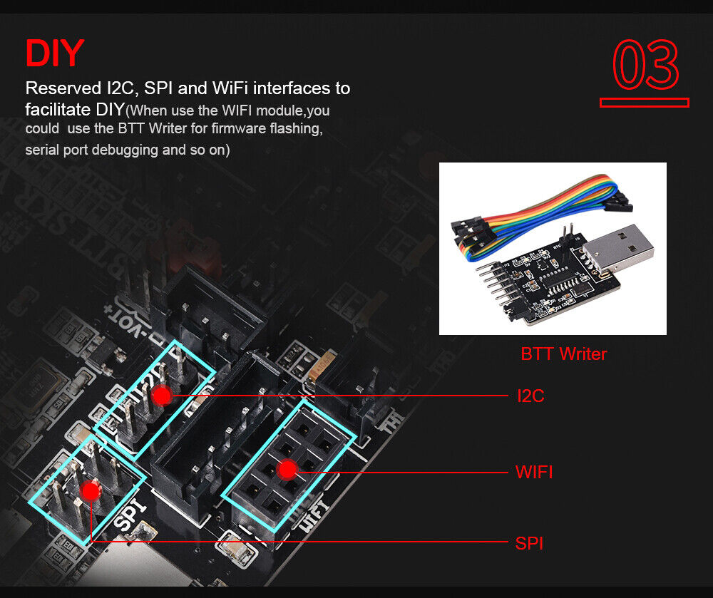 Reserved 12C,SPl and WiFi interfaces to facilitate DIY(When use the WIFI module,you could use the BTT Writer for firmware flashing and serial port debugging.