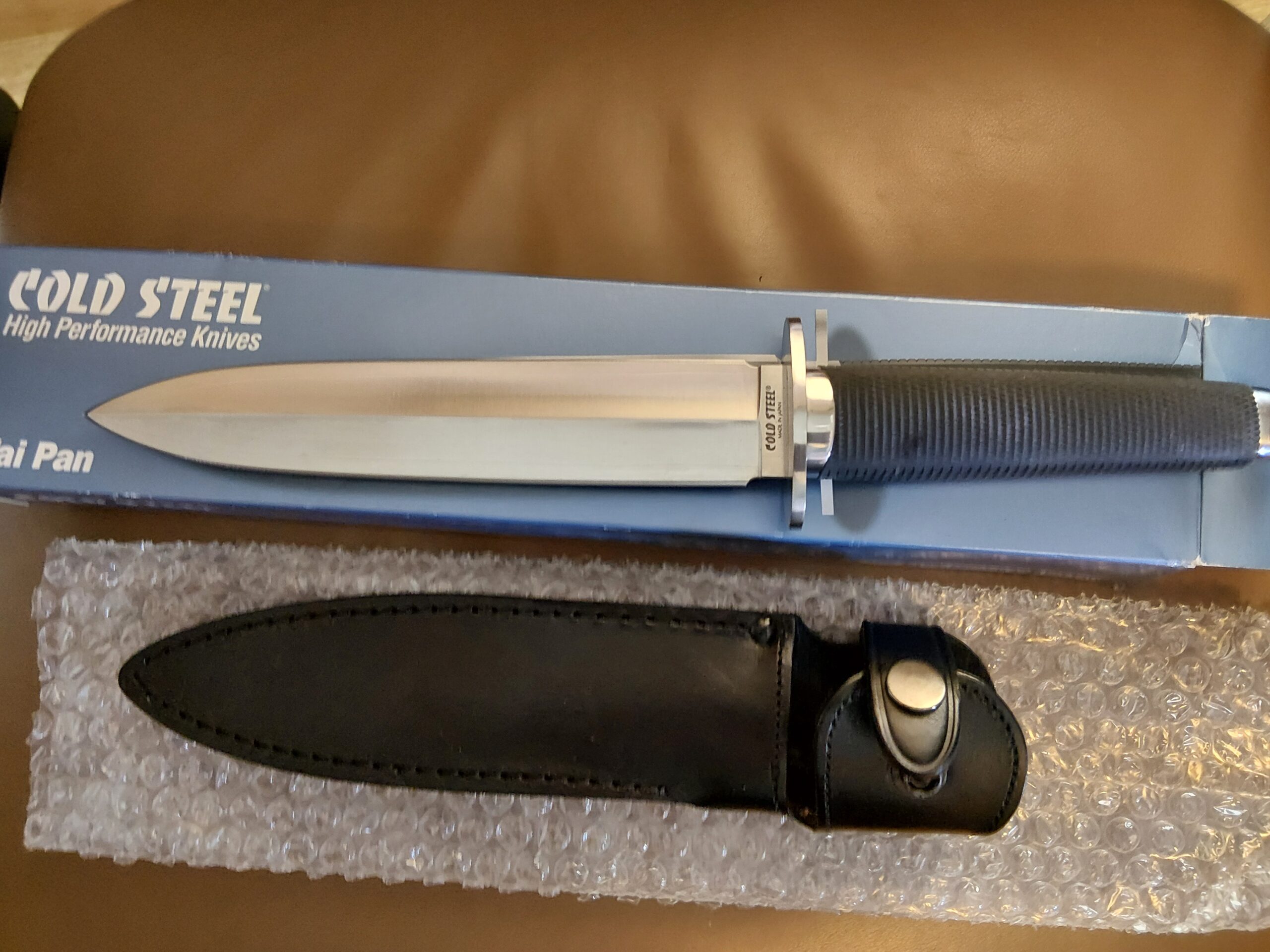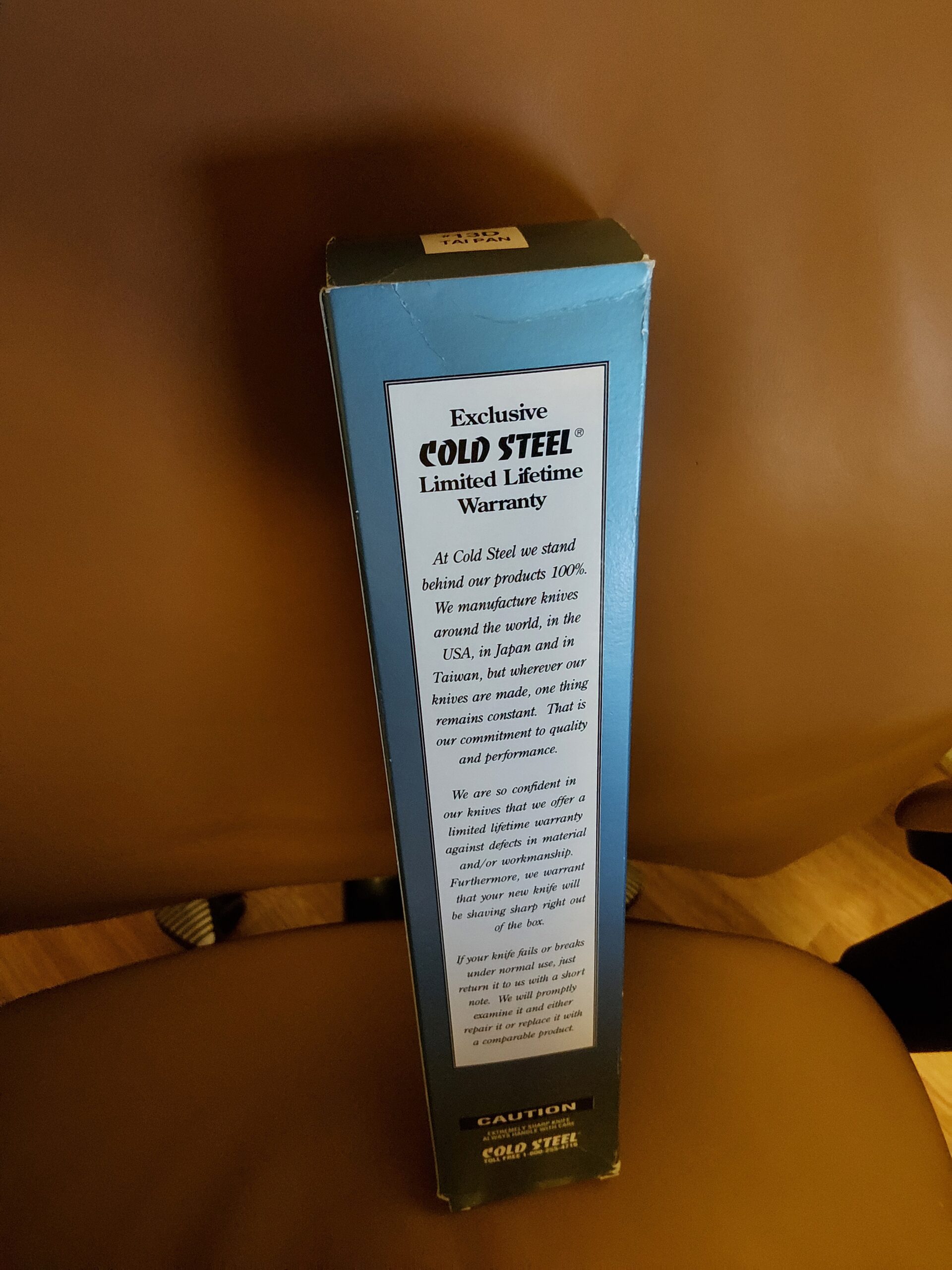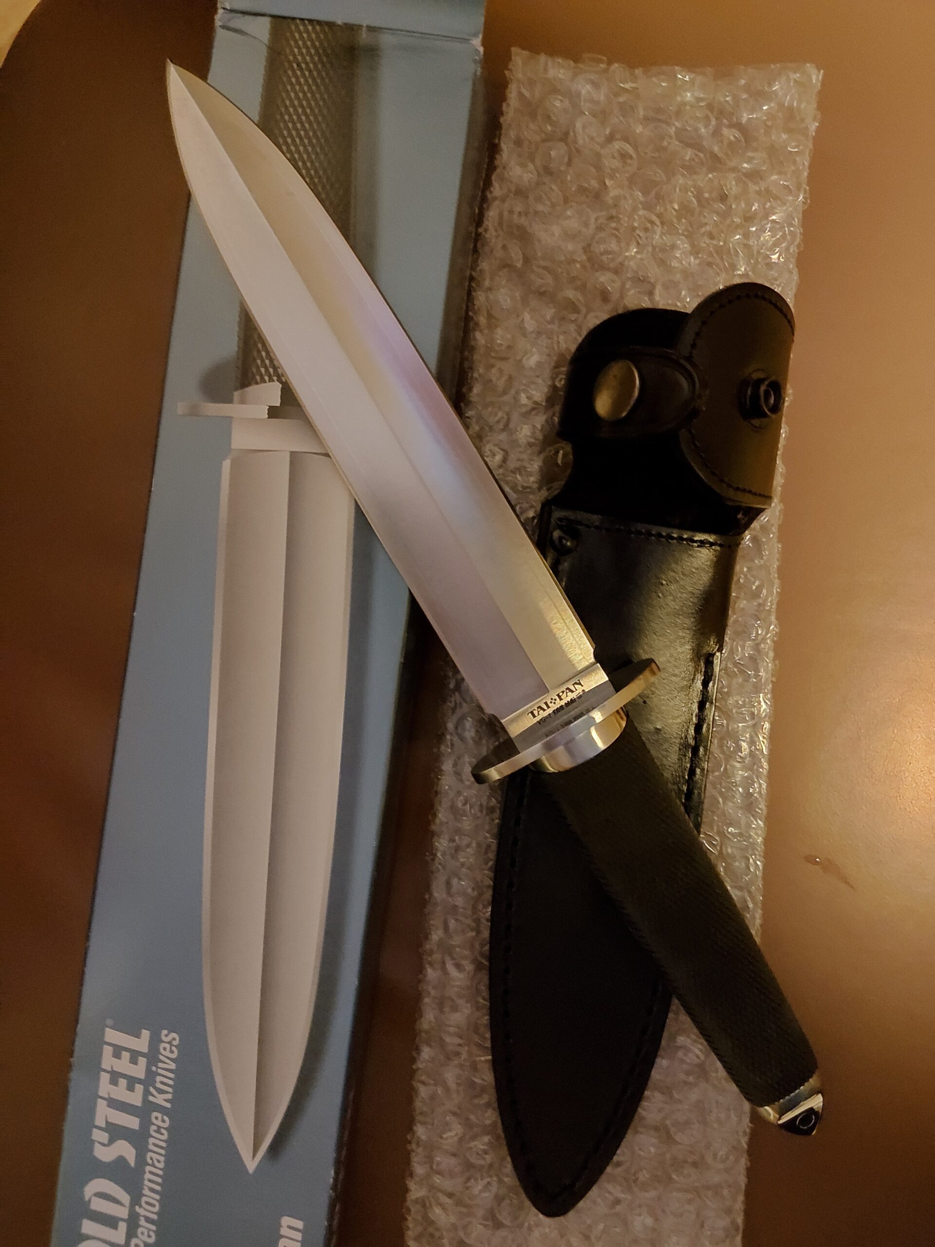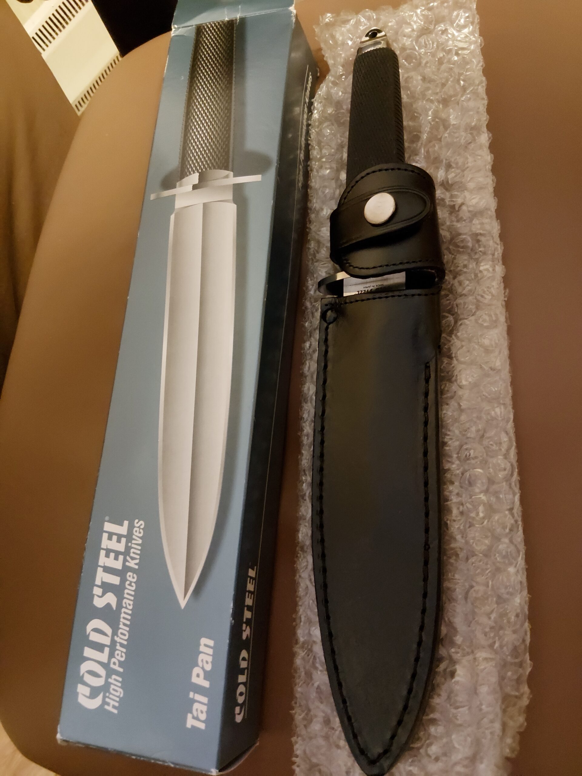Cold Steel Tai Pan San Mai ny i eske med skinnslire: Tai Pan ( CS13D) 19cm blad og 33cm totalt. Blade Length: 7 1/2″ Overall Length:13″ Steel: VG-1 San Mai III® Weight:10.8 oz Blade Thickness: 3/16″ Handle:5 1/2″ Long Kray-Ex™ Sheath:Black Leather Sheath