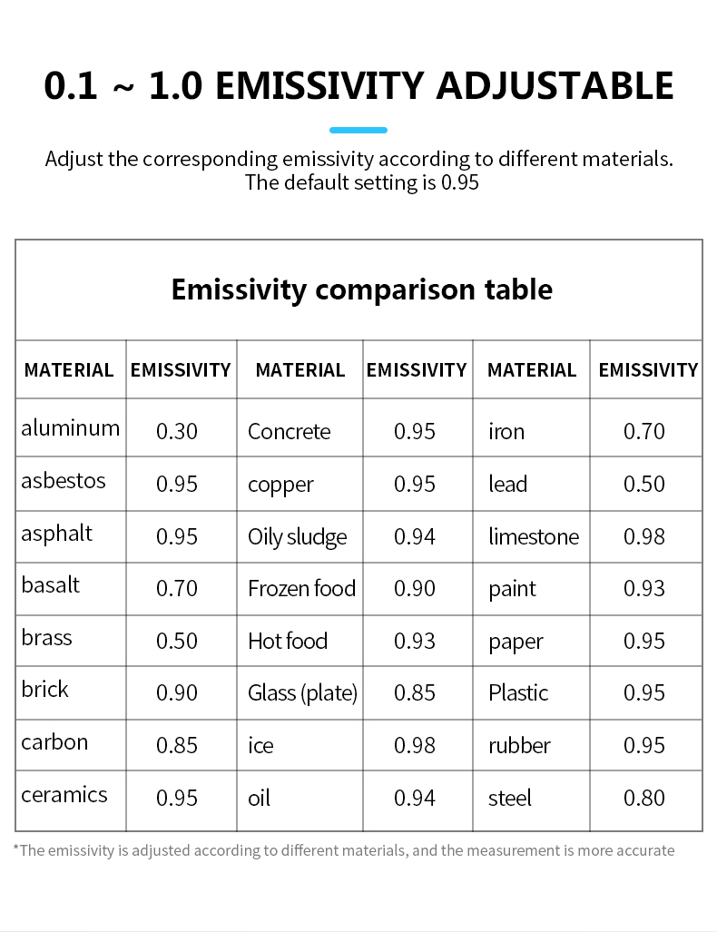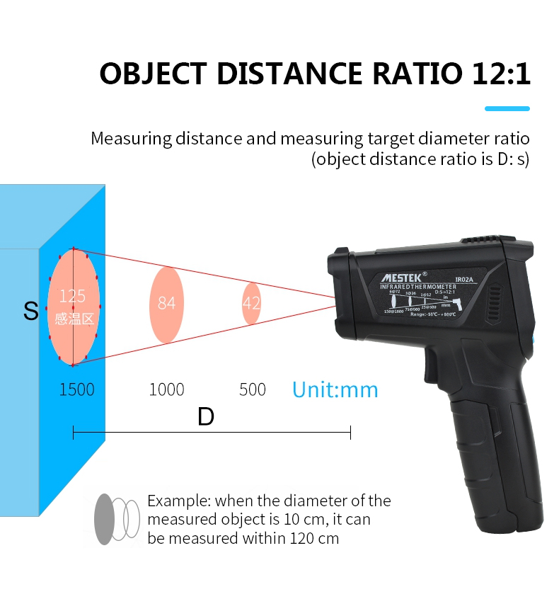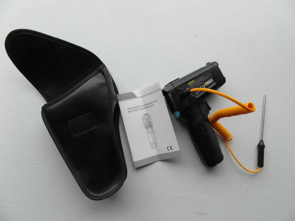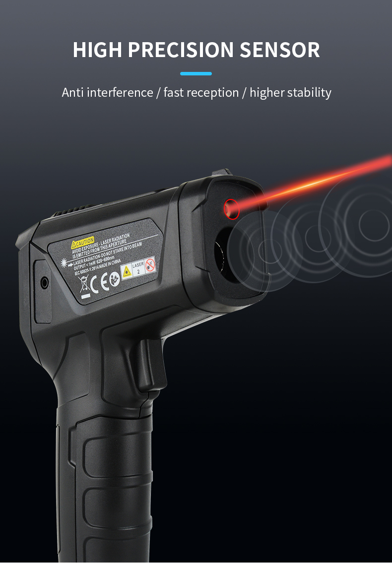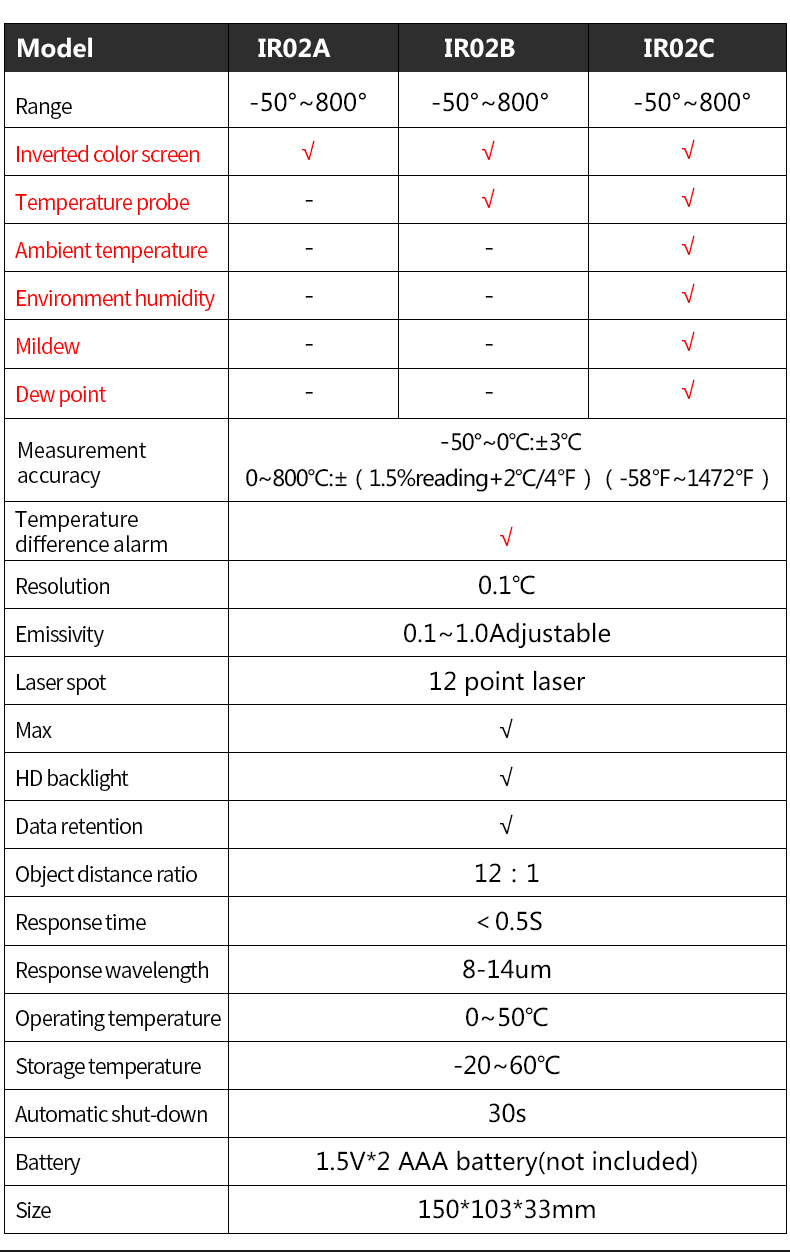 Note:battery is not included Model:IR02A,IR02B,IR02C Range of temperuature measurement: IR02A:-50~800C IR02B:-50~800C,with temperature probe IR02C:-50~800C,with temperature probe ,ambient temperature:-10~60C,ambient humidity:0%~100%RH Mildew and Dew point temperature D:S : 12:1 Emissivity:0.1~100 ajustable Response spectrum :8~14um Laser positioning:12 point ring indicating temperature sensitive zone Laser :<1mW/630-670nm level 2 Response time:<0.5s Temperature difference alarm:free set upper limit and lower limit alarm in temperature range Automatic shutdown :30 seconds