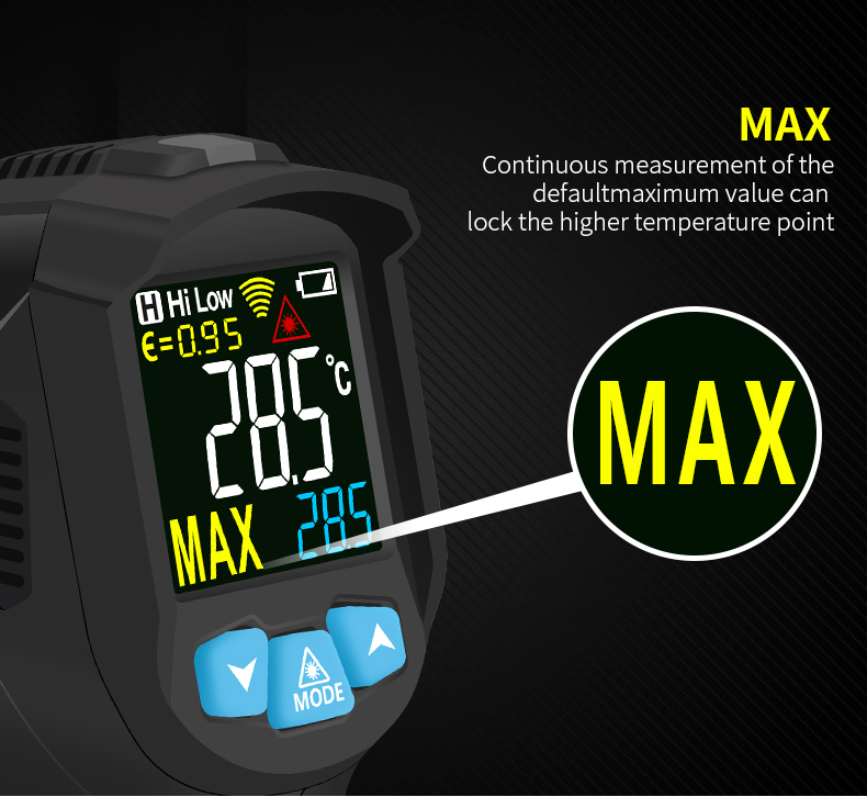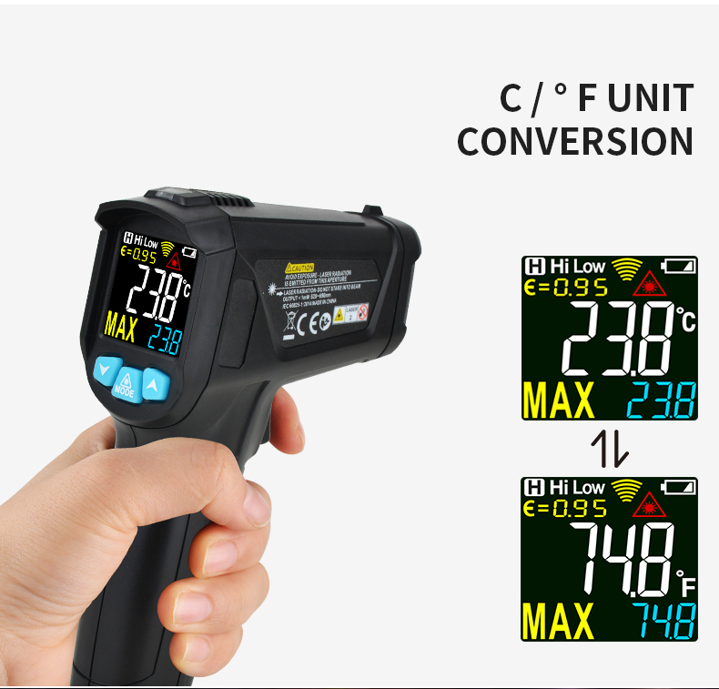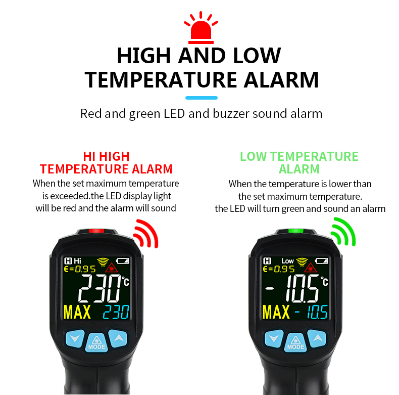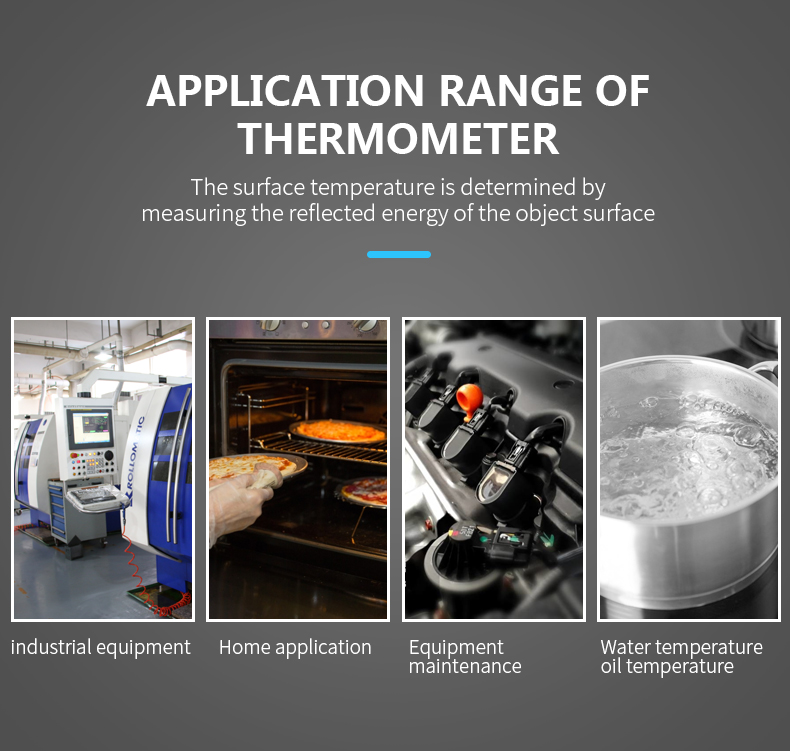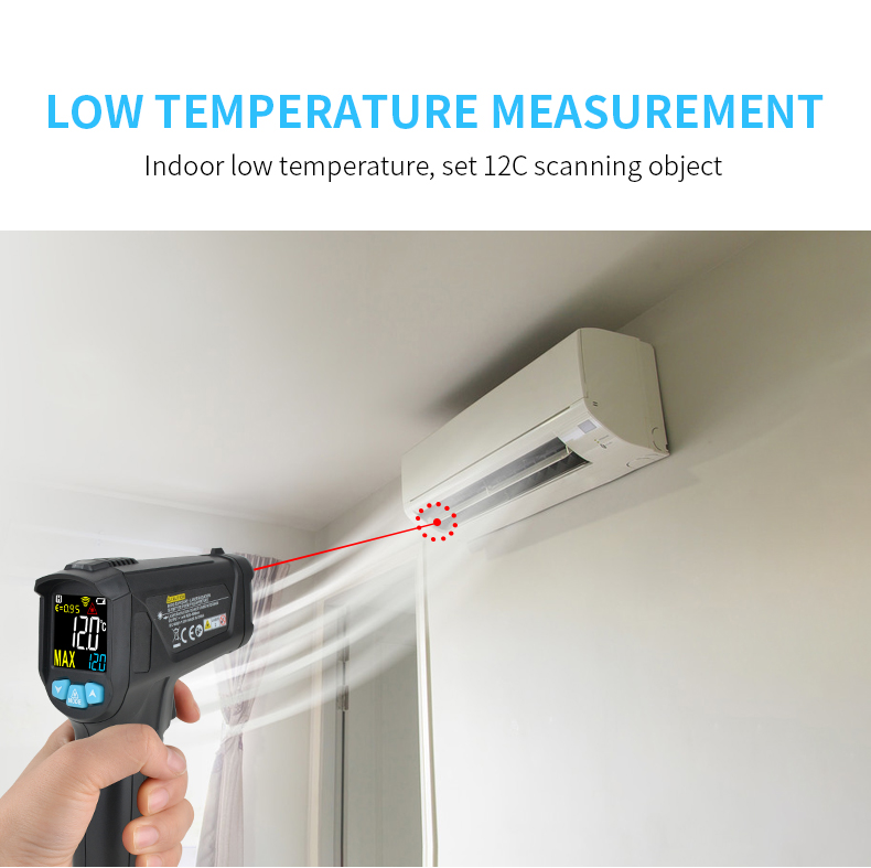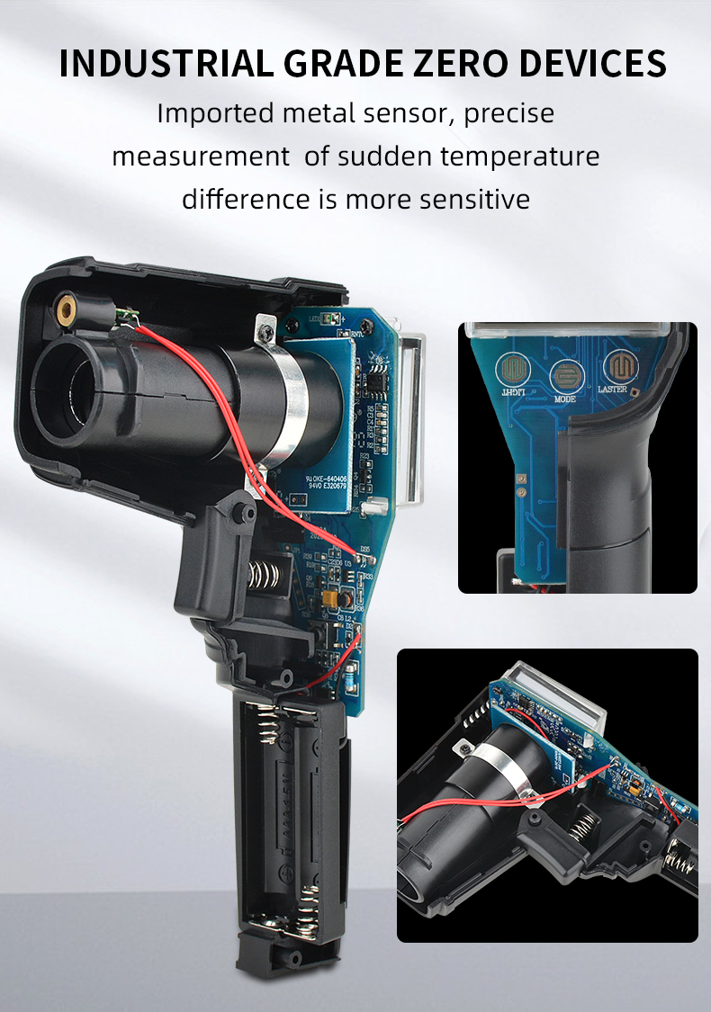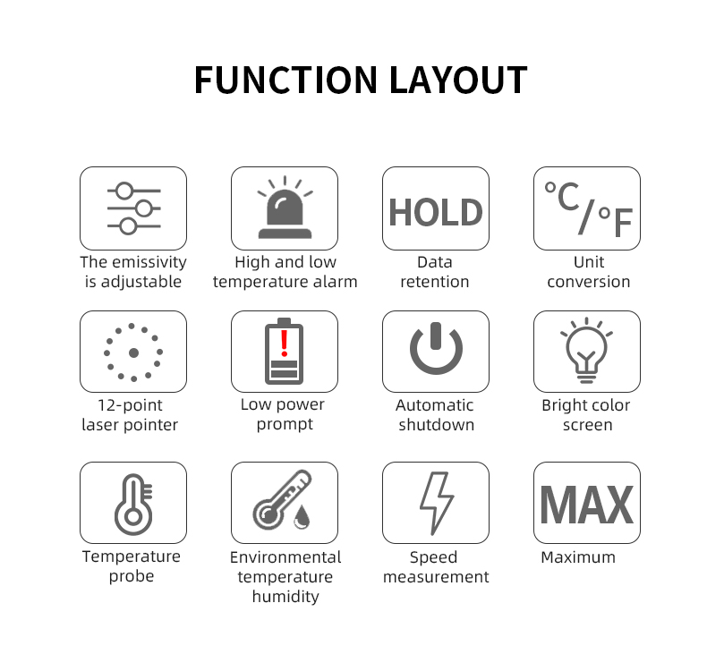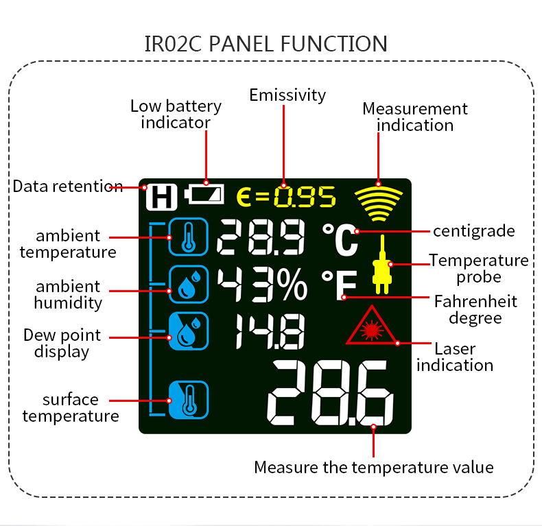 1.Non-contact industry thermometer with 12 points temperature test area indicate 2.Temperature difference alarm, maximum and minimum values can be set 3.IR02B, IR02C with contact probe, can accurately measure liquid temperature 4.other functions:Mildew temperature,Dew point temperature(Only for IROC2C)