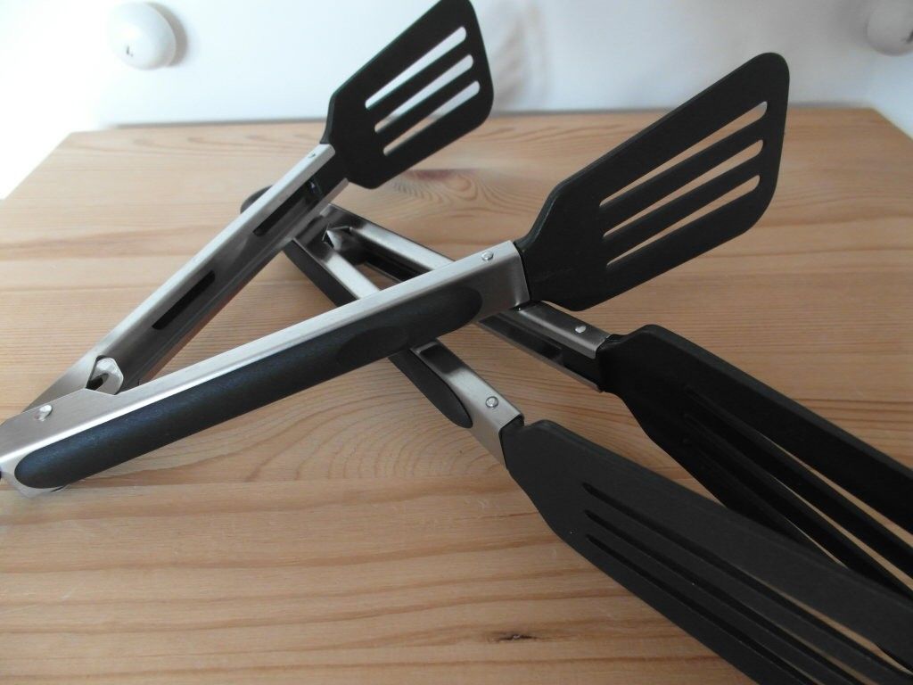 Kjøkkenredskap med gripeevne og siler ut vann f.eks til å ta kokefisk biter ut av vann, til å ha i salatbolle eller til å snu ting i stekepannen.