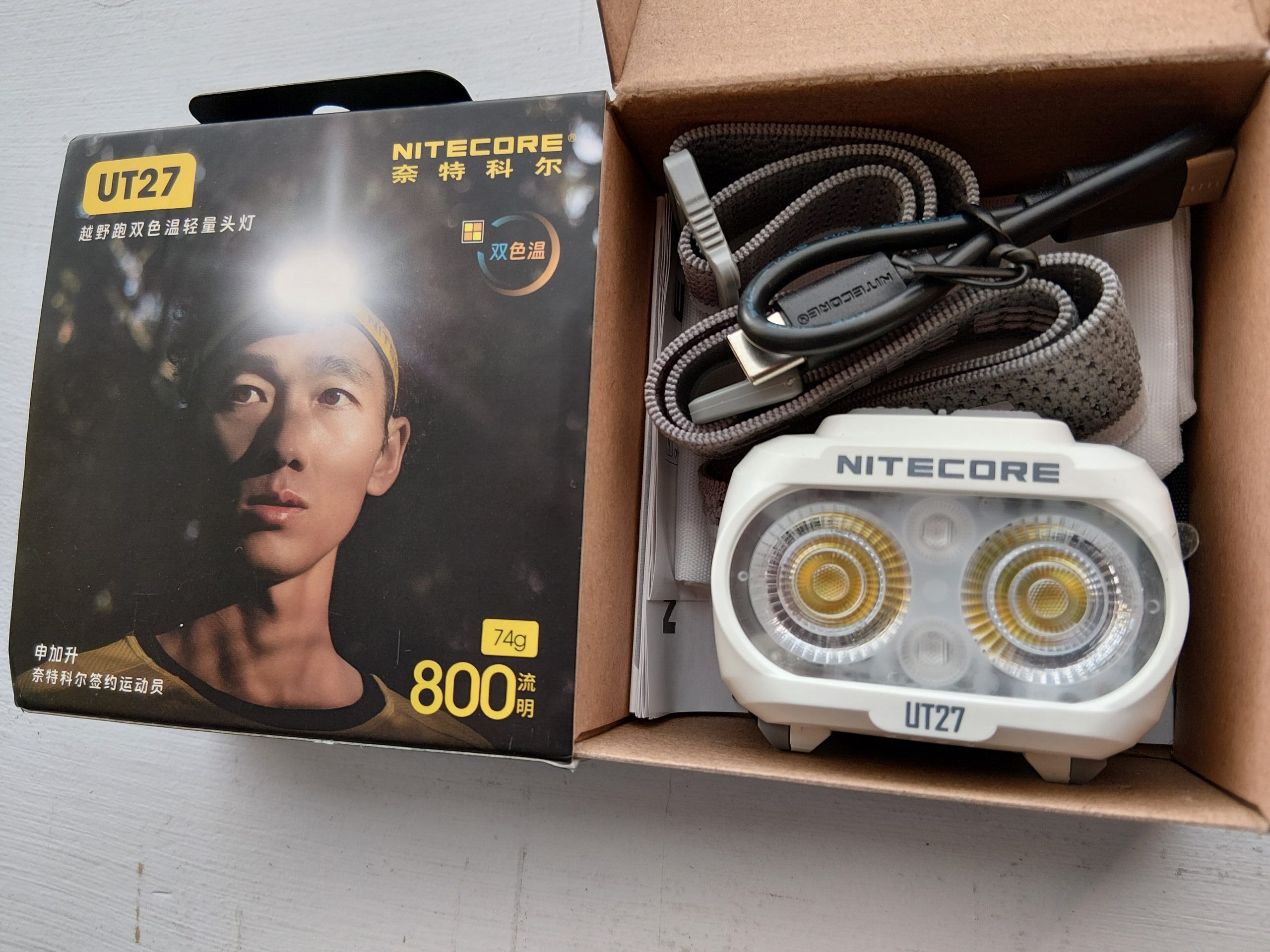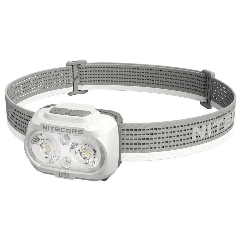 Hodelykt HVITGRÅ UTGAVE fra Nitecore UT27. Oppladbar med USB-C. Nitecore UT27 er en ultralett hodelykt som veier kun 74 gram, utviklet for løping, fotturer og utendørsaktiviteter. Den kombinerer kaldt hvitt lys (5700K), varmt lys (3000K) og rødt lys, med en maksimal lysstyrke på 800 lumen og en rekkevidde på opptil 168 meter. Den drives av et oppladbart HLB1500 Li-ion-batteri (inkludert) eller tre AAA-batterier (ikke inkludert). Hodelykten er IP66-klassifisert og støtsikker opptil 1 meter.