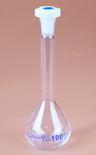 Målekolbe klasse A med ringmerke og sliptopp (12/21). Inkludert propp av polyeten.
