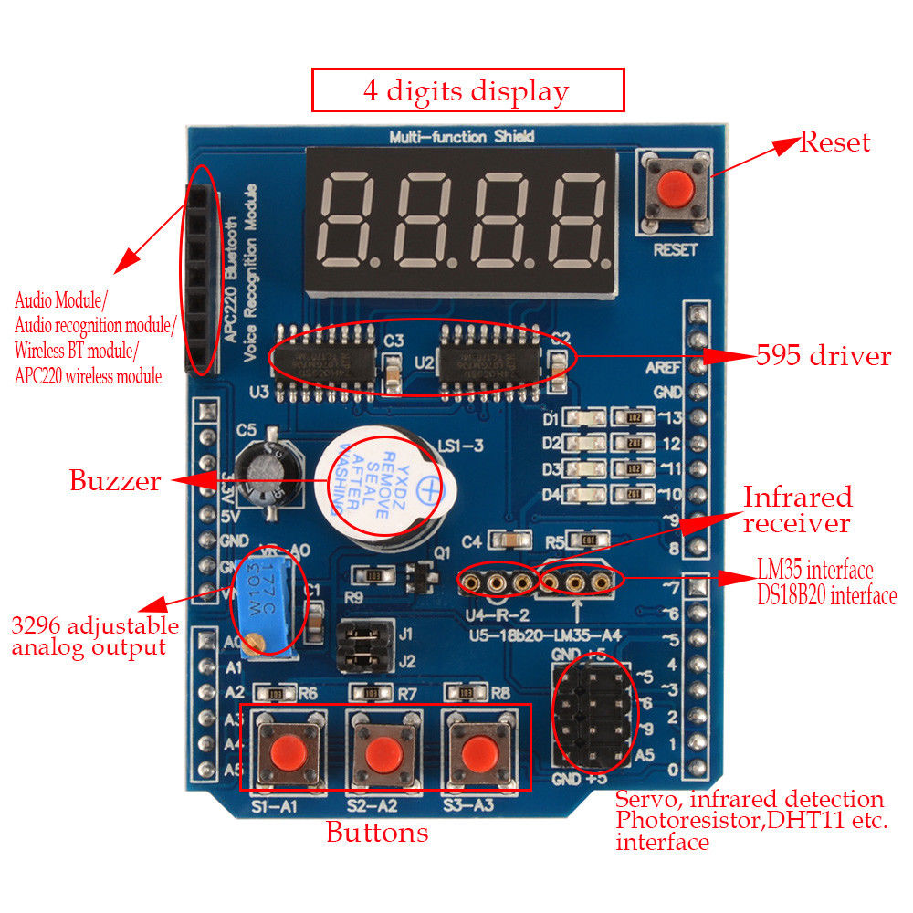 Integrated infrared receiver socket that can fit any infrared remote control experiments (Infrared receiver is not included).