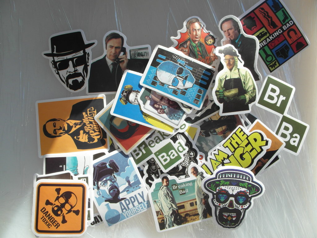 Selges under ett, haug med ubrukte klistremerker fra filmene/seriene breaking bad og better call saul , kjent som verdens beste tv-serier, merkene er heller tegneserieaktige, ikke noe foto kvalitet.