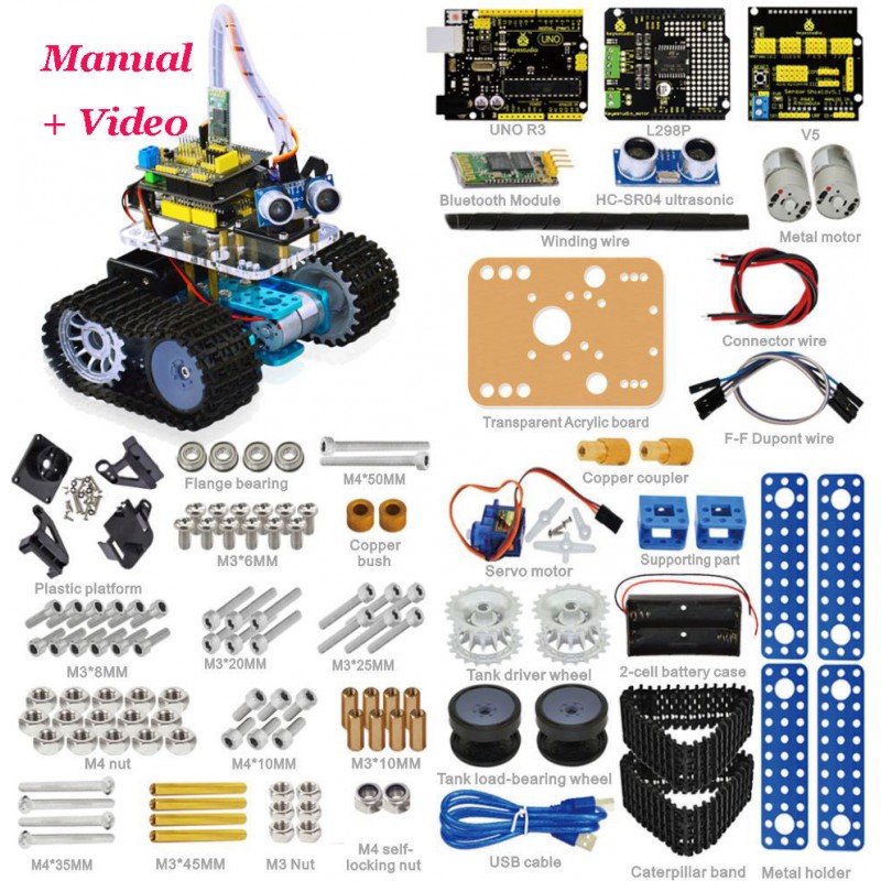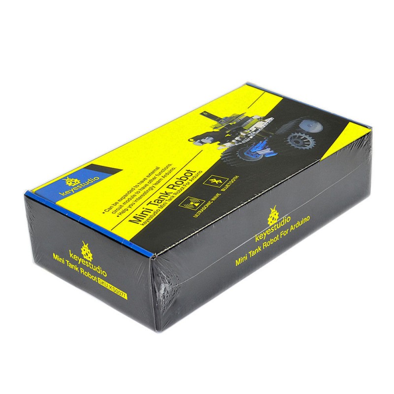 Mini tank robot is a is a learning application development system of microcontroller based on Arduino. It has functions such as ultrasonic obstacle avoidance, bluetooth remote control. This kit contains many interesting programs. It can also be expanded with external circuit modules to have other functions. This kit is designed to help you learn Arduino in a funny way. You can learn Arduino MCU development ability while having fun. Our engineers have prepared application tutorial for this car, click below link to download it now! Download tutorial We have also prepared 3D installation video for this car kit, click below link to watch and learn now! https://www.youtube.com/watch?v=vGSjn7XFXPU&list=PL2K0ws7Tl3rEZcZoEzh4kZsIRuG6AEYTZ Parameters Motor parameters: 6V, 150rpm/min Use L298P driver module for motor control. Equipped with Ultrasonic module, can detect whether there are obstacles ahead, and thedistance between the Tank robot and the obstacles to realize obstacle avoidance function. Equipped with Bluetooth wireless module, can remotely control the robot after pairing with mobile phone Bluetooth. Can be connected to external 7 ~ 12V power supply; with various sensor modules, it can realize various functions. Kit list 1. UNO R3 controller * 1 2. L298P shield * 1 3. V5 sensor shield * 1 4.HC-SR04 ultrasonic sensor module * 1 5.keyestudio Bluetooth Module (HC-06) * 1 6.Holder (PC) * 1 7.Servo motor * 1 8.Transparent Acrylic board * 1 9.Metal holder * 4 10.Tank driver wheel * 2 11.Tank load-bearing wheel * 2 12.Caterpillar band * 2 13.Metal motor * 2 14.Copper coupler * 2 15.18650 2-cell battery case * 1 16.USB cable (1m) * 1 17.Copper bush * 2 18.Flange bearing * 4 19.Hexagon copper bush (M3*10MM) * 4 20.Hexagon copper bush (M3*45MM) * 4 21.Round Screw (M3*6MM) * 10 22.Round Screw (M4*35MM) * 4 23.Inner hexagon screw (M3*8MM) * 10 24.Inner hexagon screw (M3*20MM) * 6 25.Inner hexagon screw (M3*25MM) * 6 26.Inner hexagon screw (M4*10MM) * 6 27.Inner hexagon screw (M4*50MM) * 2 28.M3 Nut * 6 29.M4 self-locking nut * 2 30.M4 nut * 15 31.Connector wire (150mm, black) * 2 32.Connector wire (150mm, red) * 2 33.F-F Dupont wire (20CM, 4Pin) * 1 34.Supporting part (27*27*16MM, blue) * 2 35.Packaging carton (L255*W138*H65mm) * 1 36.Packaging carton (Accessories box, L135*W100*H55mm) * 1 37.Packaging carton (wheel box, L55*W55*H135mm) * 1 38.Winding wire (12CM) * 1