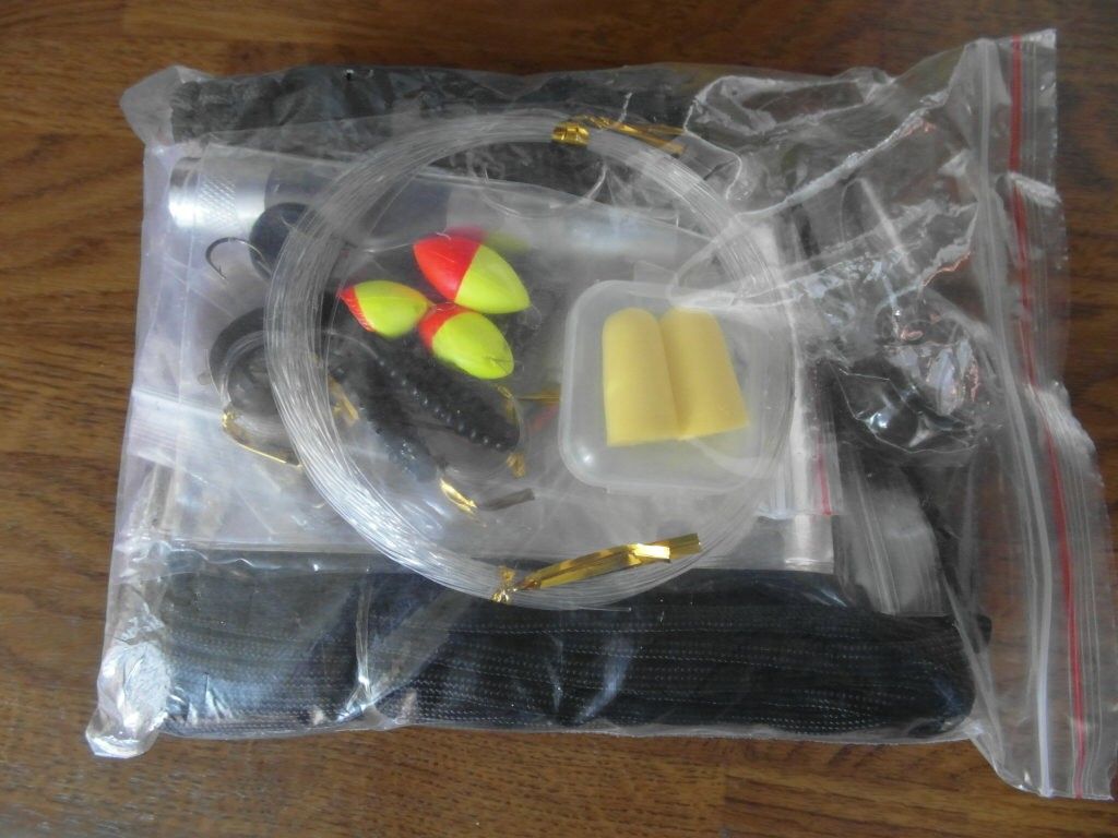 Kun tatt ut for å ta bilder av, stor myggnetting til hode  aluminium varme innpaknings laken 140×210 kompass fløyte minilykt sagesnor kort fiske-snøre øreplugger sikkerhetsnåler fiskeutstyr og annet. Svart snor i front der er nå inkl ett annet sett og ikke dette.