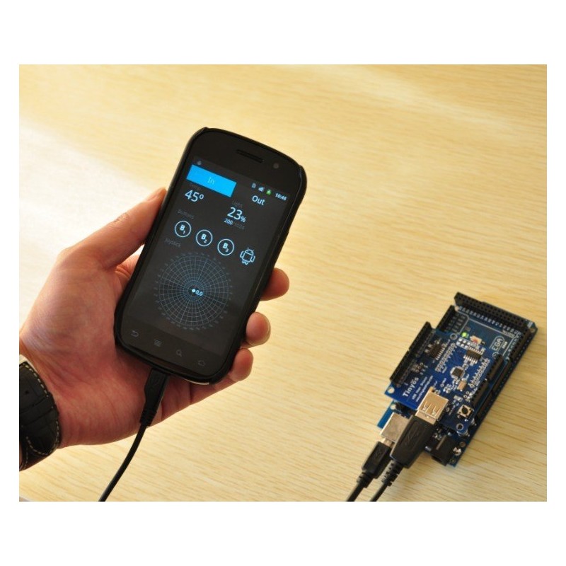 This is revision 2.0 of USB Host Shield. Arduino USB Host Shield board – Let your Arduino support Android phone Support Google Android ADK function, support Android phone: G1, Nexus One, Nexus S, Motorola Droid X (Phone system needs upgrading to Android 2.3.4, Tablet PC need to upgrade to Android 3.1) Arduino compatible with the following hardware: Arduino Uno 328 Arduino Diecimila / Duemilanove 328 Arduino Mega 2560 (recommended) Arduino Mega 1280 Using Arduino USB HOST function, let your Arduino communicate with other USB devices, and supports USB HUB function.