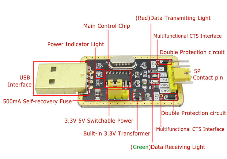 Description: Module size: Approx. 4 x 2.2cm / 1.57 x 0.86 inch Color: Golden Brand new CH340G original chip Switchable output TTL level 3.3V/5V (with jumper) 3.3V and 5V output voltage to supply the programmed controller With power light PWR, TXD and RXD indicator light Used to upgrade various device Used for different diagnostics Can be used for Gas LPG ECU interface adjustments