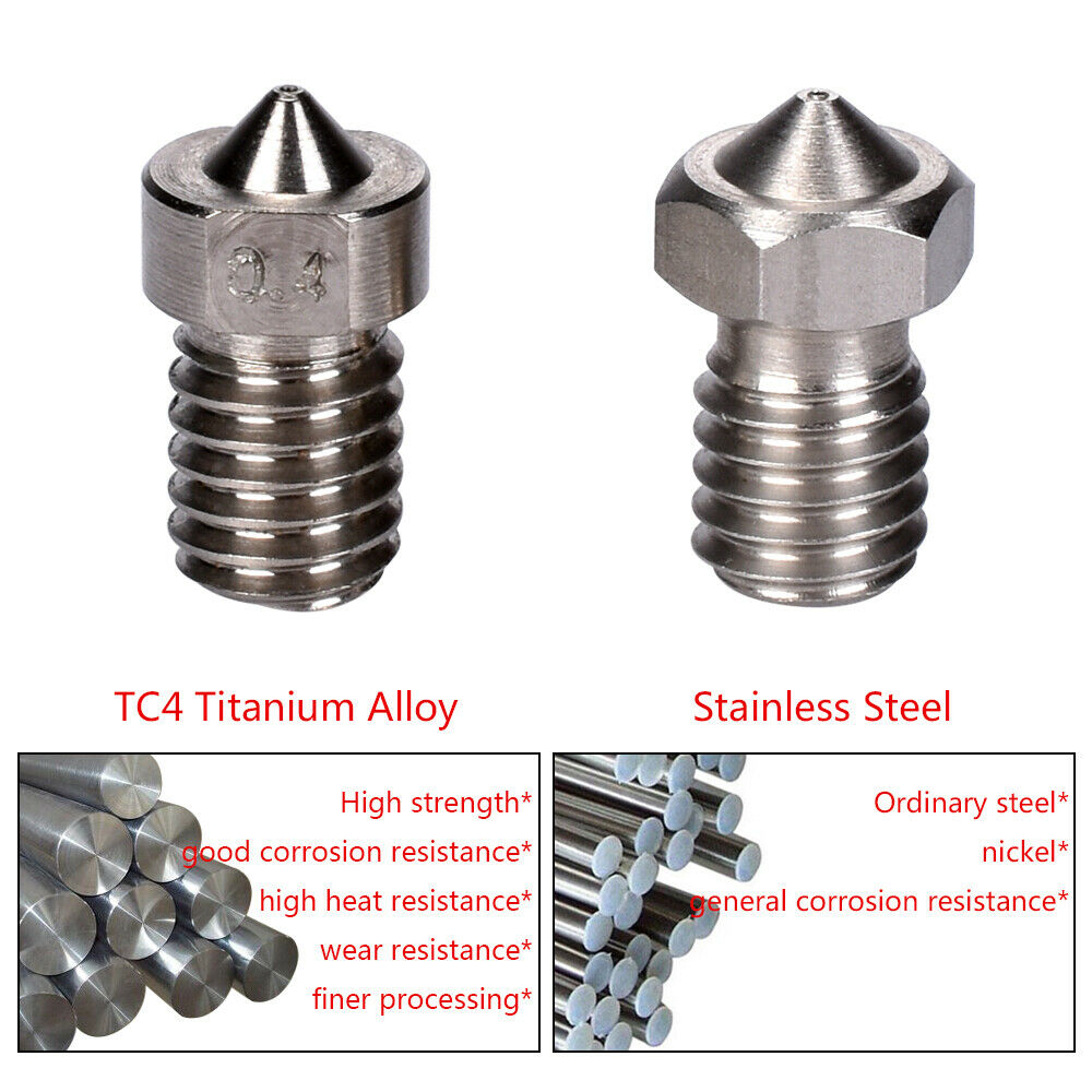 Titanium alloy nozzles are produced according to the E3D series nozzle size and are produced from TC4 titanium alloy materials. The composition of TC4